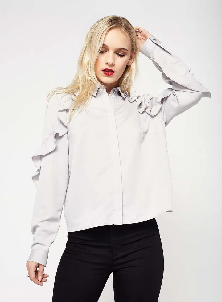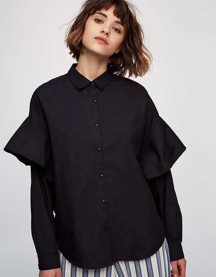 Frill details can change the whole look of a shirt. Style tip: since the frills are the center of attention for this outfit, let it shine with a pair of basic black trousers. Or a beige one, if you are all about colour-blocking.