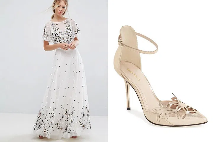 French Connection embroidered maxi dress, SGD 538.75, from www.asos.com. Shop it here. Klub Nico leather heels with floral cut-outs, SGD 255.92, from www.nordstrom.com. Shop it here.
