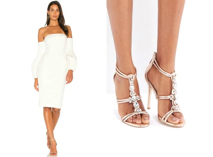 Misha Collection polyester blend dress, SGD 530.41, from www.revolve.com. Shop it here. Asos High Shine embellished heeled sandals, now SGD 96.98, from www.asos.com. Shop it here.
