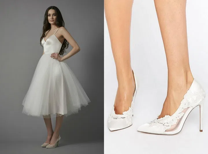 Catherine Deane satin and tulle dress, available at Frieda Brides. Asos pointed lace heels, now SGD 96.98, from www.asos.com. Shop it here.