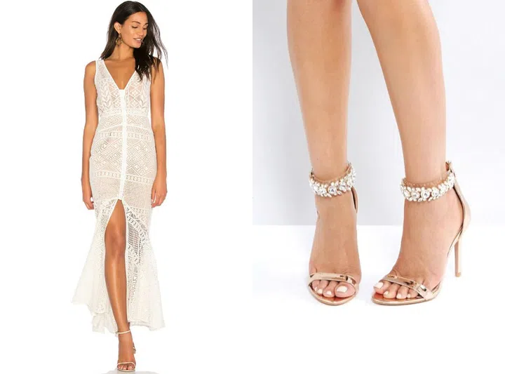 We Are Kindred lace midi, SGD 530.41, from www.revolve.com. Shop it here. Public Desire fiji rose gold crystal ankle heeled sandals, now SGD 86.18, from www.asos.com. Shop it here.
