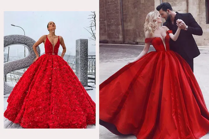 An eye-catching red and a plunging neckline makes up the recipe for a statement look that'll get everyone's heads turning as you waltz into the room.