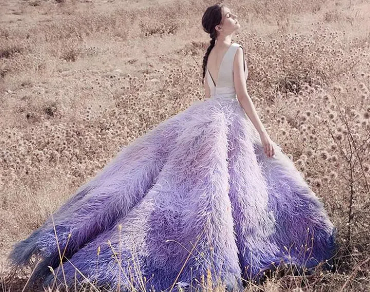 A dramatic plumed skirt is set to wow. Add compelling gradating shades of purple and it's bound to be a showstopper.