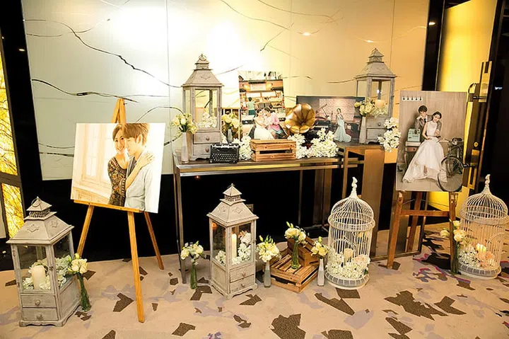 The pretty, vintage-inspired photo display with their pre-wedding snaps in the foyer.