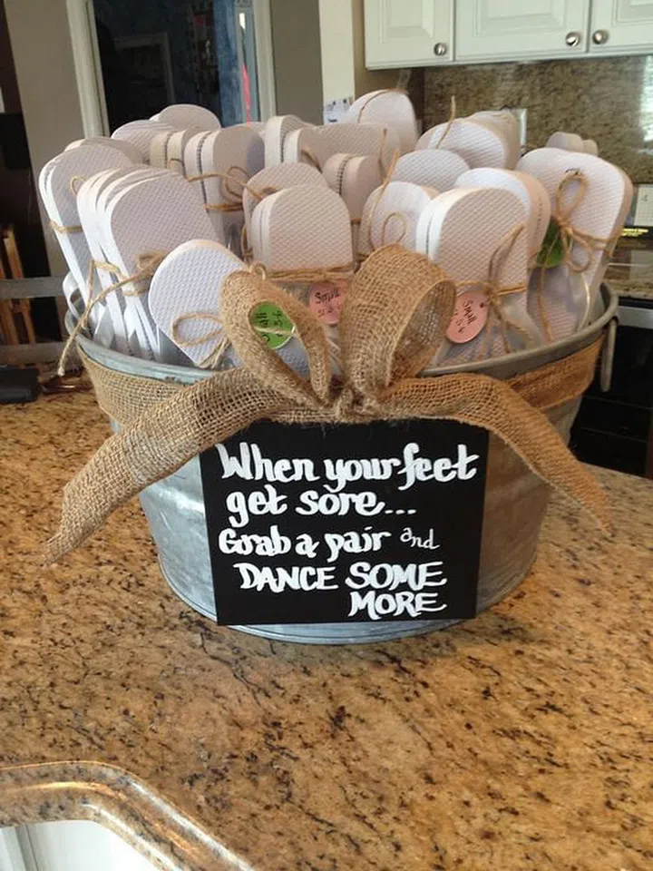 Whether you're having a beach wedding or ballroom reception, stylish flip flops or flat shoes are always good to have - for men in their dress shoes, and ladies in their heels. Do note that you'll have to try to get most (if not all) of your guests' shoe sizes, and ensure your wedding venue is warm enough for them to remove their shoes.