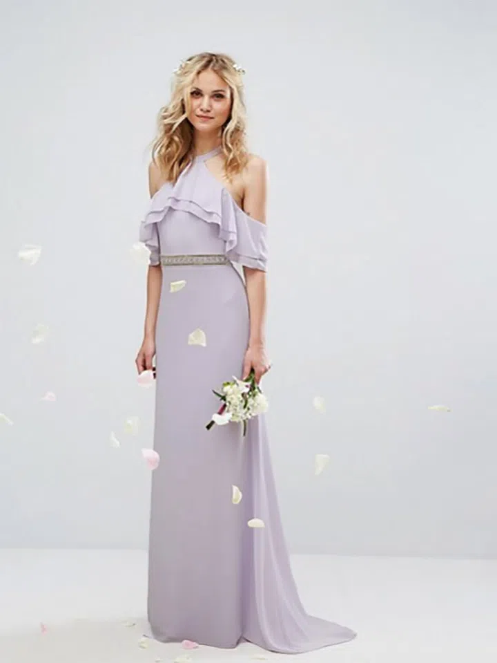 A halter neck with frill overlay gives dimension to this simple silhouette while the embellished fitted waist adds to the glam and elegance to your overall look.