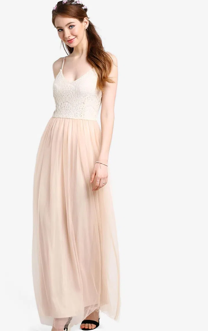 Twist and twirl in this dress with an embellished bodice and a tulle maxi skirt, looking graceful and sophisticated. For a sweet church reception to a pastel-themed restaurant wedding, this versatile number will make you look pretty in different settings.