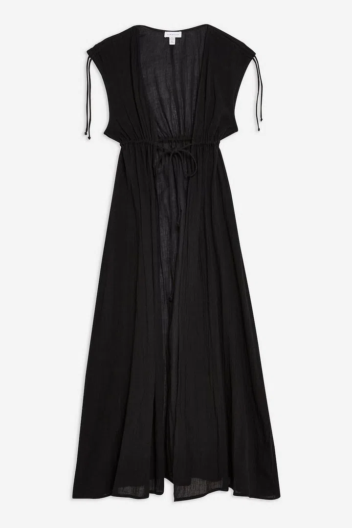 Imagine this: Your hair is up in a messy-but-cool bun, your face glistening with highlighter while you lounge by a pool party with a white bikini on. Now imagine it with this flowy black Topshop kaftan slung carelessly over your body. We’re loving that image.
