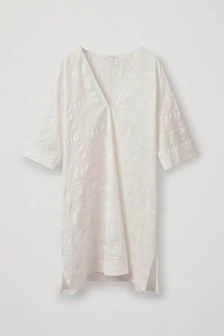 Short hem, side slits, V-neck and an airy silhouette — this white Cos piece has everything we want in a kaftan. We love that the check print makes this piece less basic. Dress it for the weekends with a pair of espadrilles and a sun hat.