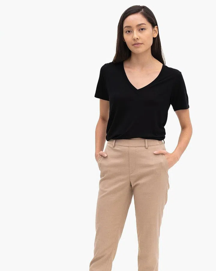 This versatile V-neck t-shirt comes with a slightly oversized fit and a low neckline that drapes effortlessly. It is elegant, chic and uber sophisticated, and can be dressed up or down depending on the bottoms you pair it with.