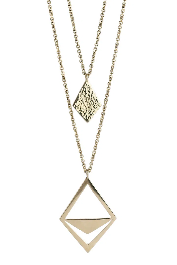 Part of the geometric collection, this features delicately hand-cut diamond shapes. The small charm features an intricate hammered detailing while the longer chain has a smooth geometric cutout that lends a contemporary and chic appeal.