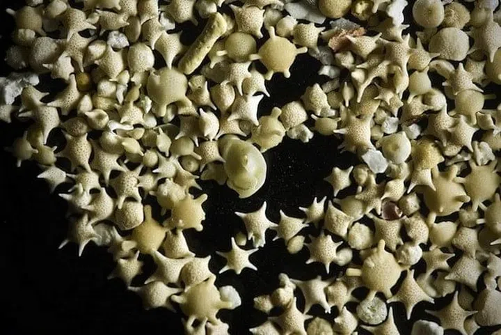These unusually shaped grains of "sand" are actually exoskeletons of foraminiferans, microscopic marine organisms, washed up on shores. These organisms are believed to date back to 550 million years ago and is one of the oldest fossils known to man.