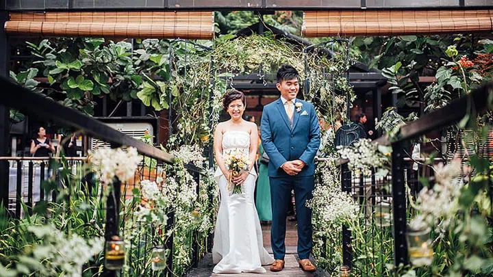 Flowers were a central theme in Sophia and Darren's magical solemnisation at Au Petit Salut. The couple got married under a custom-made flower dome with a happy, whimsical feel in the air.