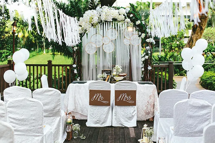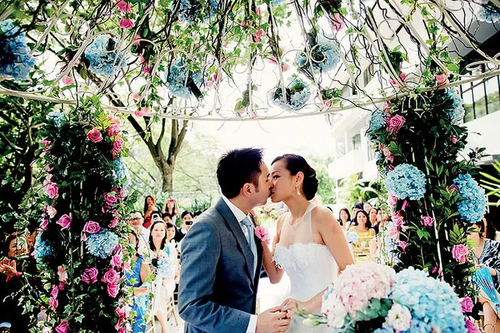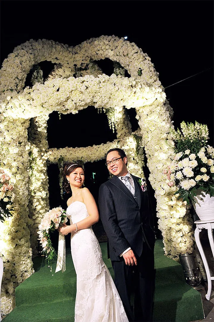 Celebrity DJ Vernon A wed blogger Jayne Tham in a lighthearted and fun-filled ceremony at the Shangri-La Hotel Singapore. The all-white wedding included decorations such as the lush arch filled with phalaenopsis orchids, roses, and ferns