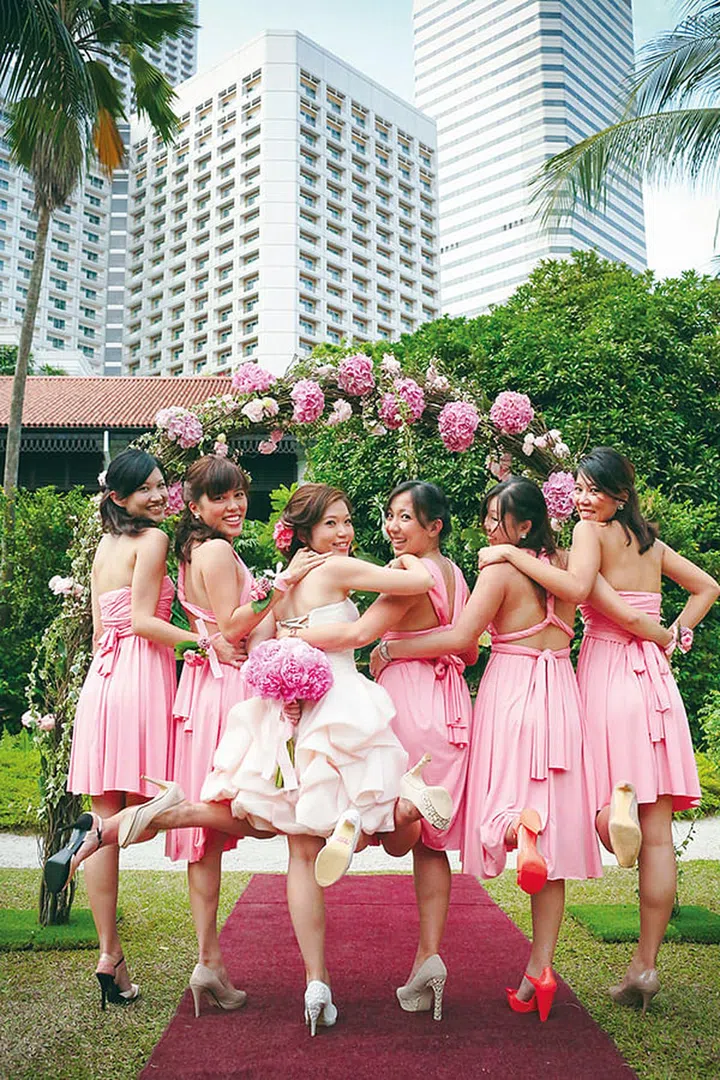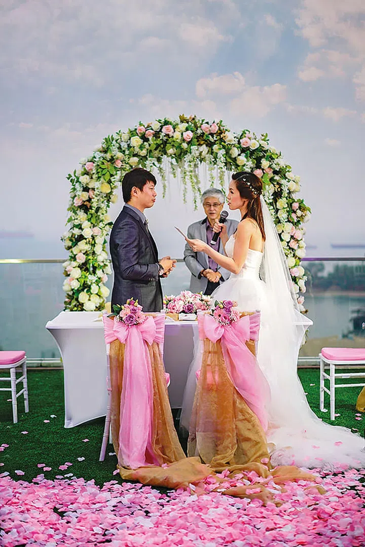 Pink featured significantly at Rachael and Alwyn's solemnisation at Raffles Hotel Singapore. The decor included the bridal bouquet of "must-have pink peonies", the pink roses in Rachael's hair, Alwyn's boutonniere, and the lush arch that was dressed with pink hydrangea and roses.