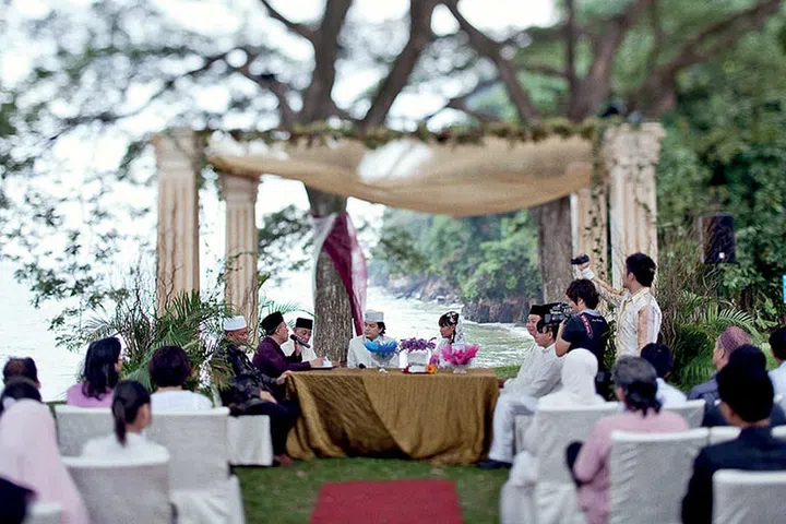 Farah & Israr exchanged vows under a grand canopy supported by four Doric-inspired columns, accompanied by the sounds of waves lapping against the shore at Shangri-La's Rasa Sentosa Resort. Photo: Her World Brides June 2012