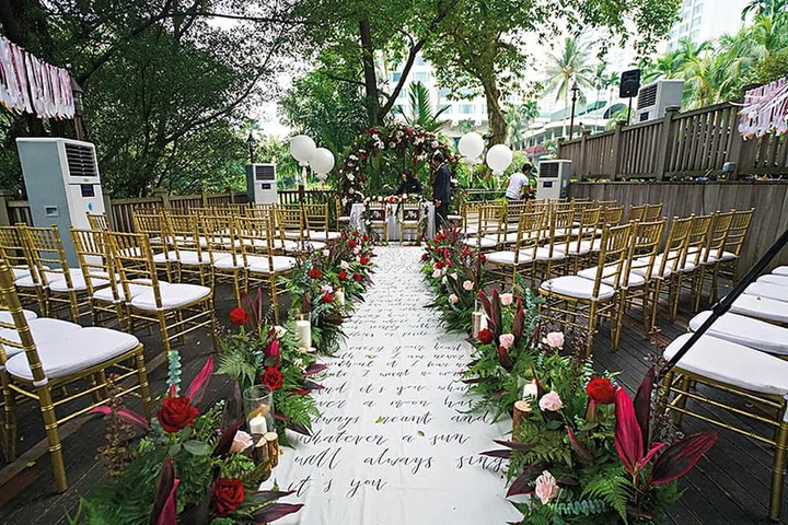 Jenny and Darren exchanged "I Dos" at the Banyan Deck in Shangri-La Hotel Singapore under a lush floral arch with a dramatic combination of lush red and pink roses.