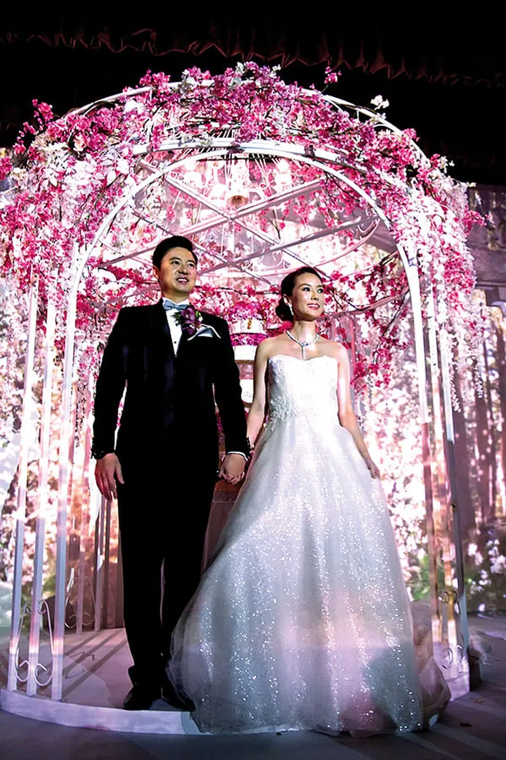 Actress Yvonne Lim and husband, former Taiwanese boy band member-turned businessman, Alex Tien's whimsical and star-studded reception at the Ritz Carlton included this gorgeous and elaborate flower-filled canopy on stage.