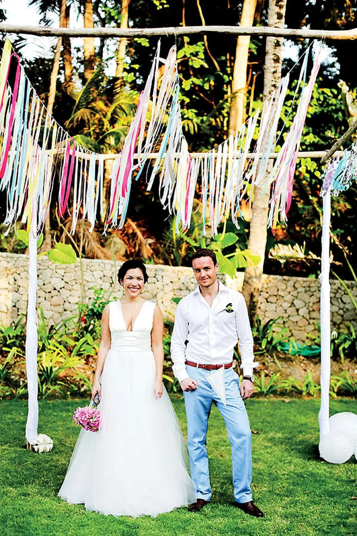 Colourful ribbon strips added a pretty and whimsical note to Vanessa and James' solemnisation ceremony on Bintan's Nikoi island.
