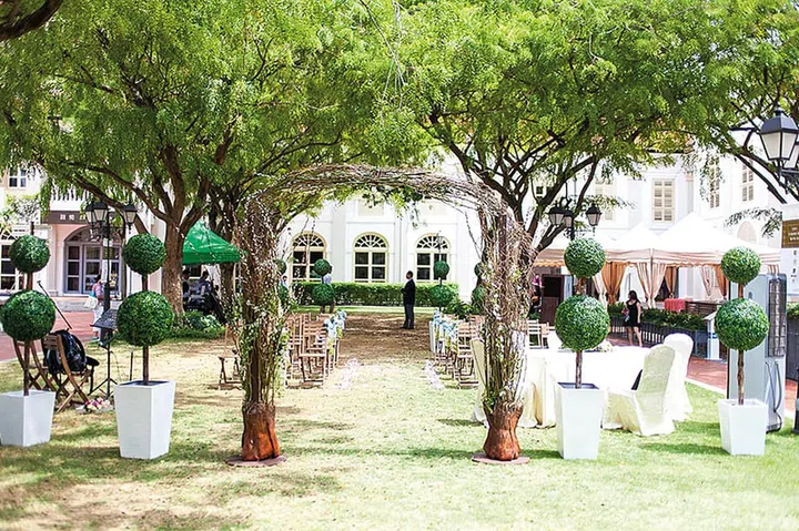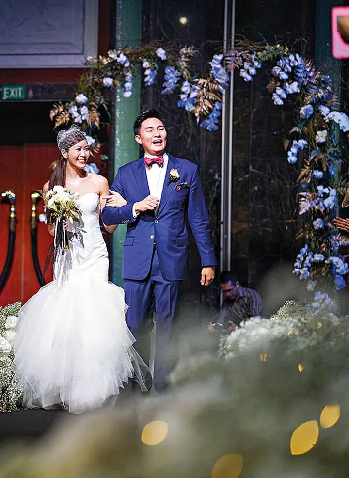 An arch comprising branches and pussy willows, supported by two potted plants, witnessed the coming together of Fanny and Caine, who wed outside Chijmes Hall.
