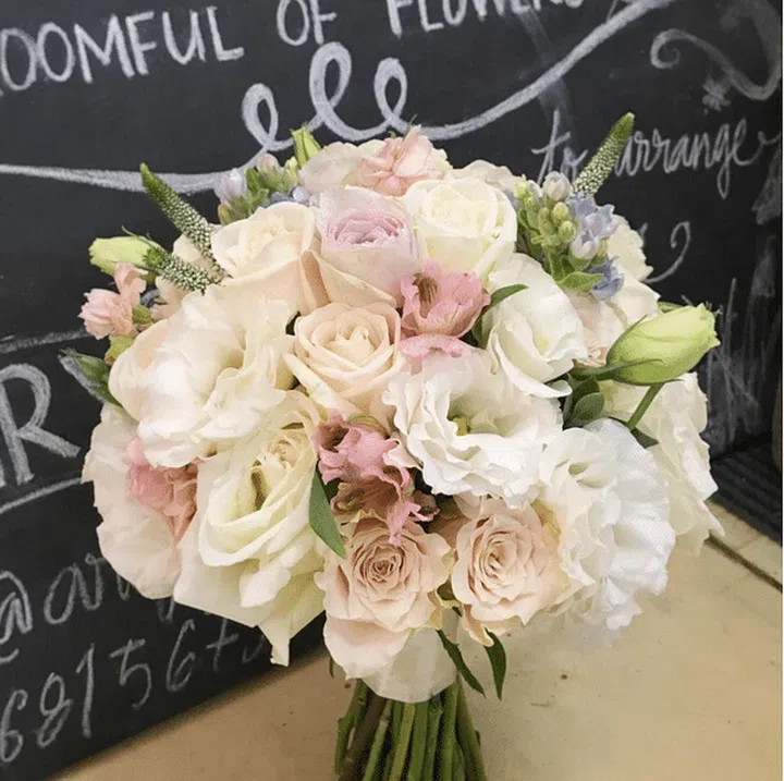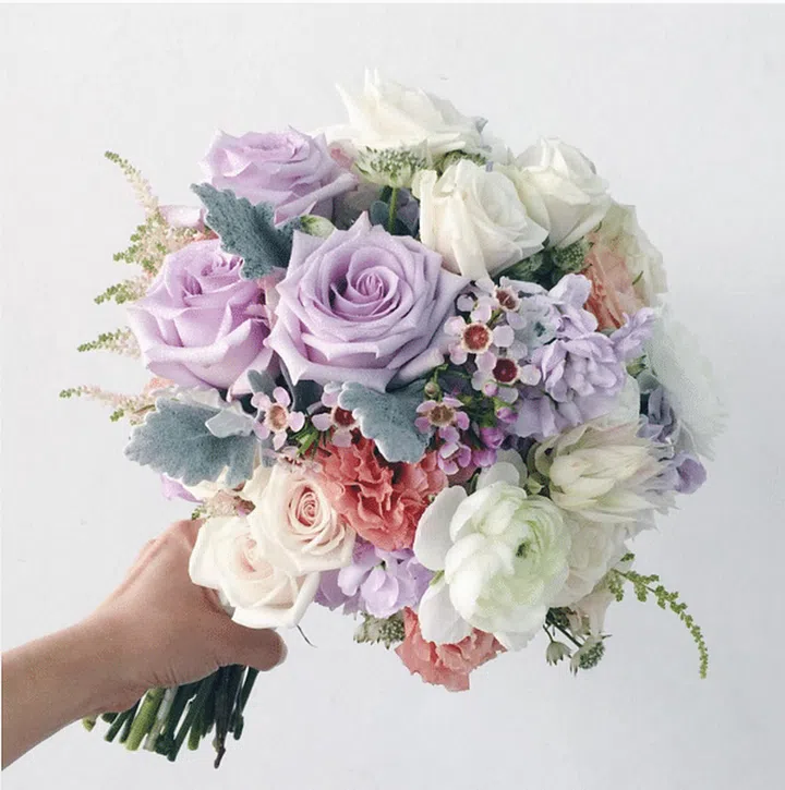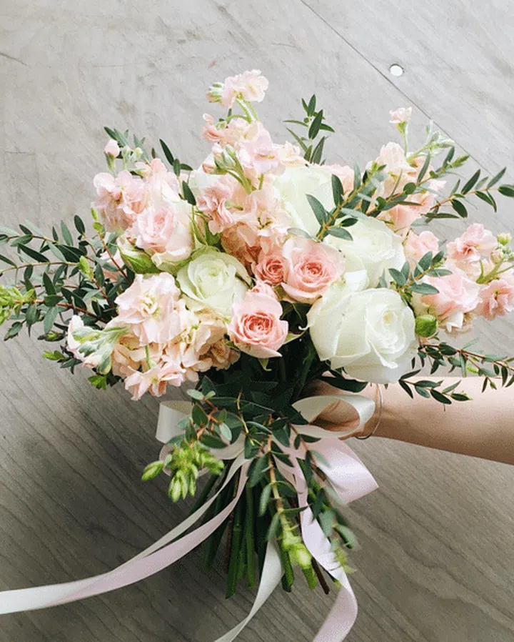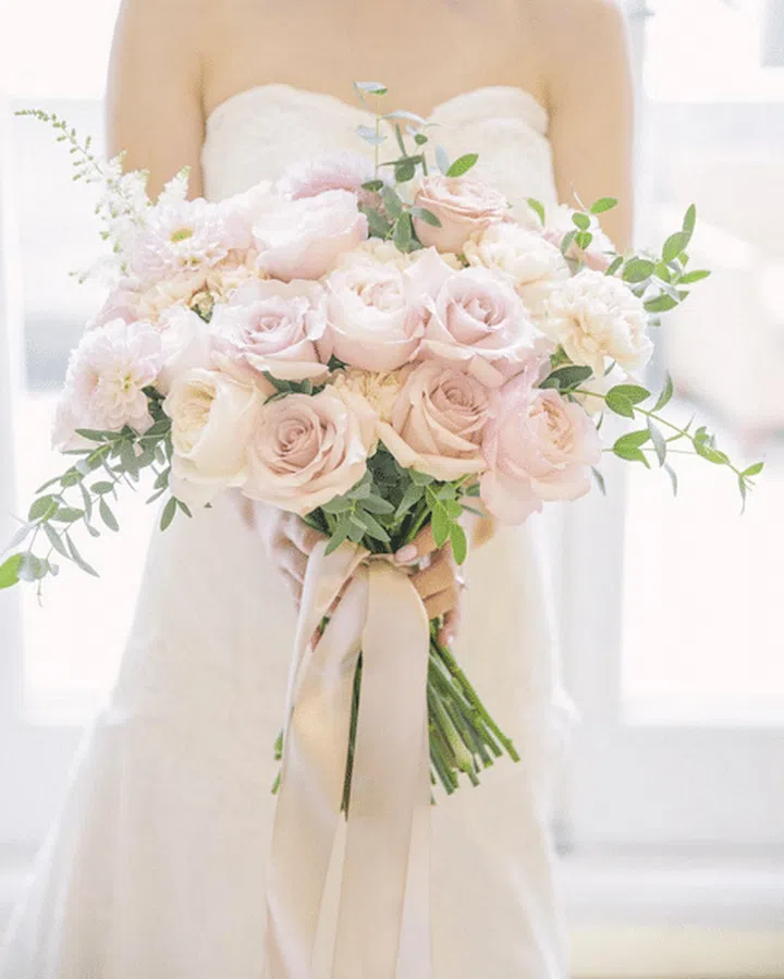 A clutch of pastel roses, eustomas, and other blooms are always romantic and refreshing.