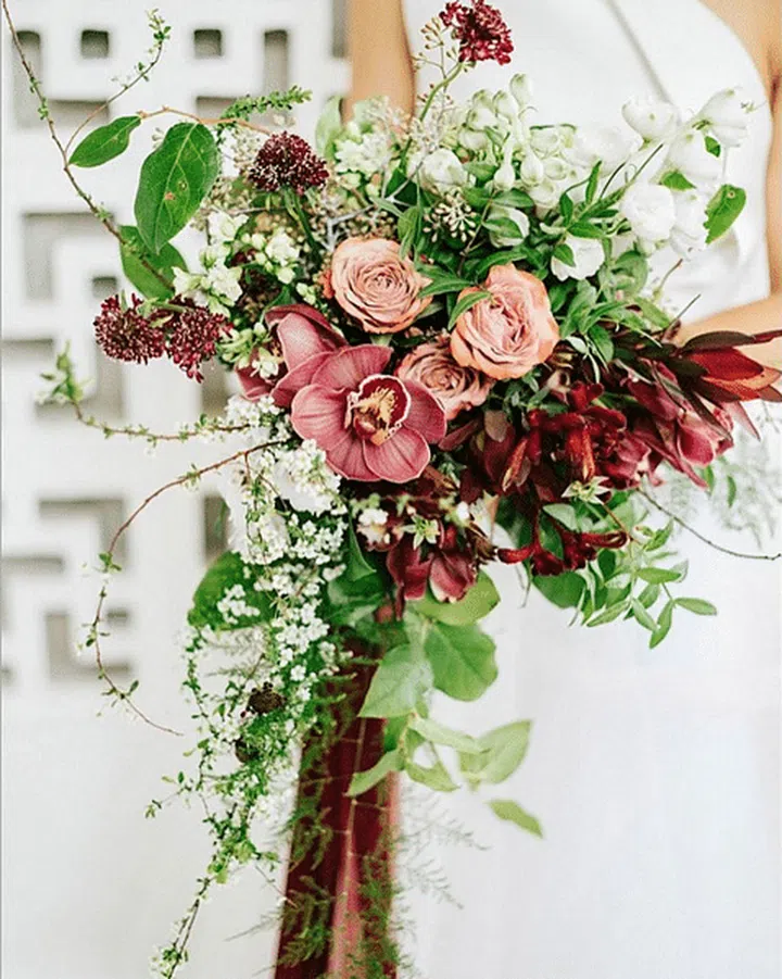 If you're undecided between having a lush horizontal bouquet or a dramatic cascading one, this beautiful arrangement is a happy compromise.