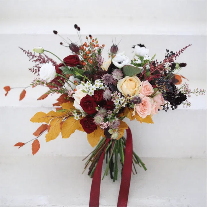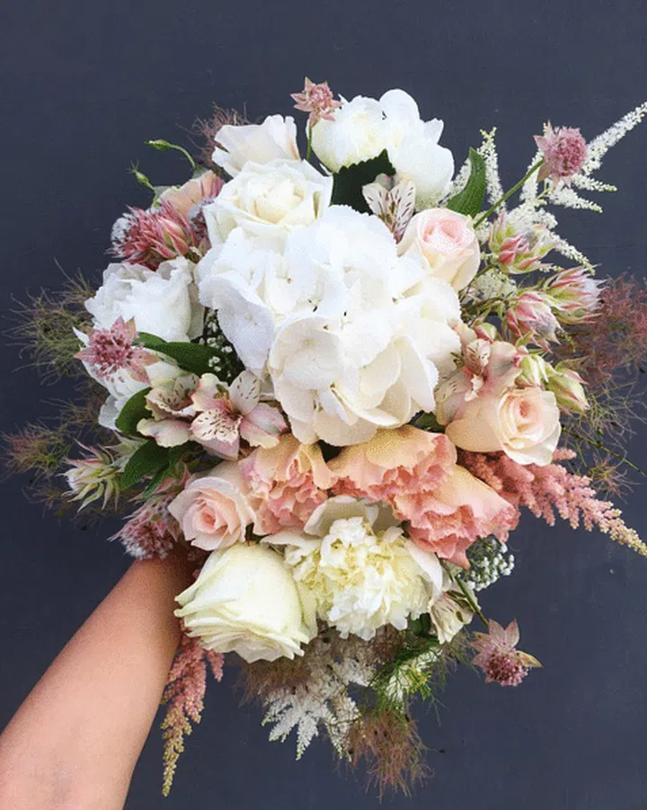 A modern mix of blooms, put together in an equally forward-looking bouquet.
