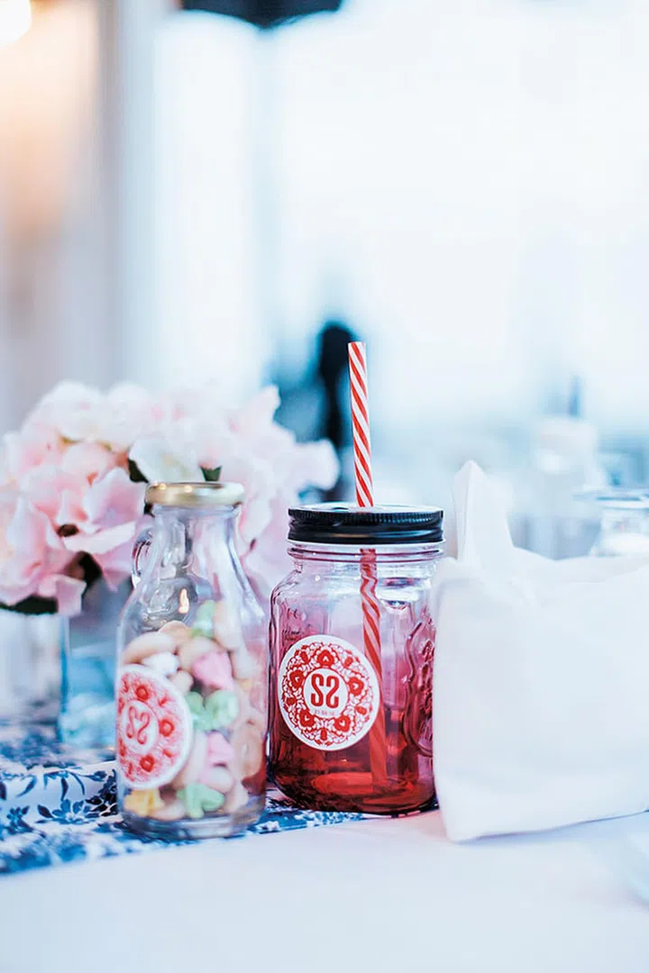 Guests went home with a bottle of iced gem biscuits and a red or blue mason jar with the wedding logo.