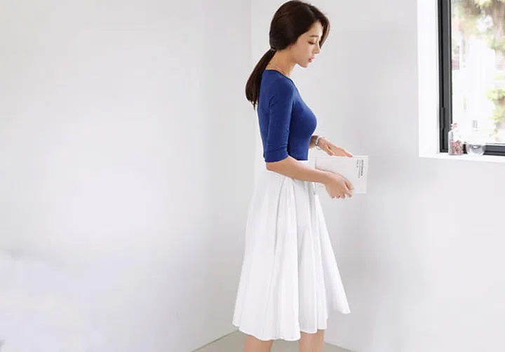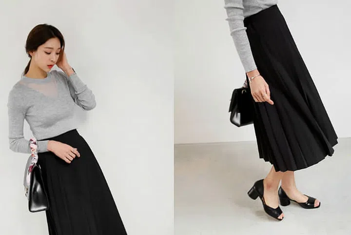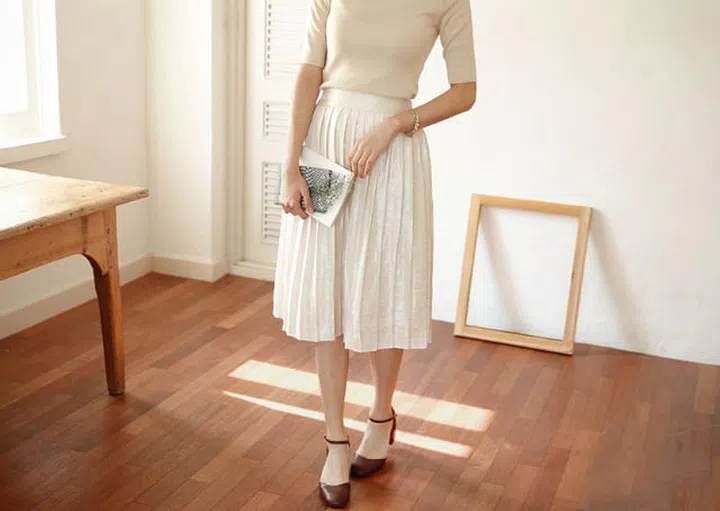 This is a graceful and feminine pleated skirt of midi length. Its soft material is comfortable, even on sensitive skin and it has elastic banding at the back of the waist, with a zipper on one side to fit up to Korean Size 66. This is a versatile piece that can be paired with a blouse, a T-shirt, and add a jacket or cardigan for a variety of styles. Shop this skirt at cool-find.me-in.kr/Judith-Pleats-Skirt