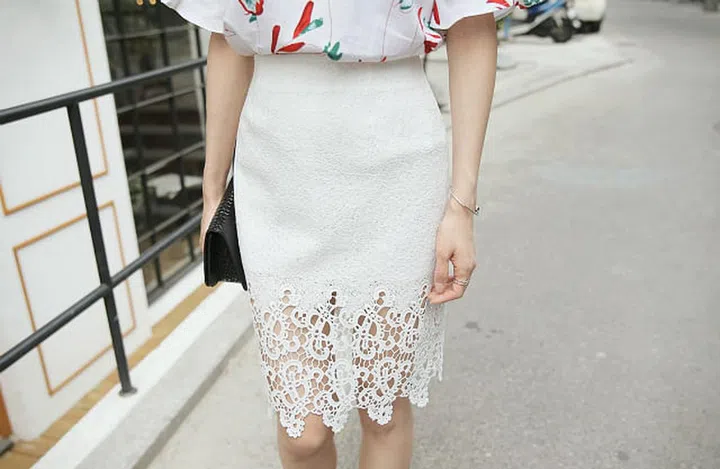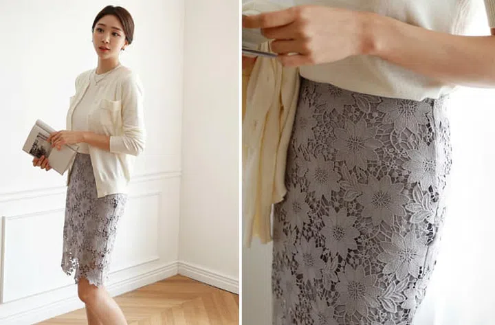 We love this feminine lace skirt with its pretty floral pattern, with a hidden zip to ensure a smooth finish. Style this skirt with a neat top and cardigan to allow the skirt to be the highlight, for a minimalist yet feminine look. Shop this skirt at cool-find.me-in.kr/Susy-Lace-Flower-Midi-Skirt