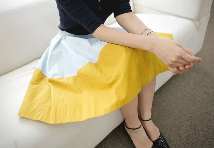 This is a stylish two-tone skirt in blue and mustard - two on-trend colours for AW16 - becomes the point of any outfit you put together. Its flare cut gives a very feminine look. There is also an inner lining for an easy and comfortable fit. Available in sizes S and M. Shop this skirt at cool-find.me-in.kr/Yasmine-Skirt