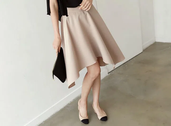 This stylish flared skirt has an asymmetrical length and is made of a soft material. Its unbalanced length enhances the flare design by creating a more natural flow when moving, giving you a very Korean style feminine look. Available in one size (best suited up to Korean Size 66), in beige and navy. Shop this skirt at cool-find.me-in.kr/Cream-Unbalance-Skirt