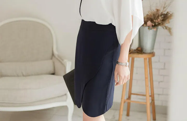 This slim skirt will bring out your best lines. The long length is offset by the vent on the left hemline with adds a sexy vibe, while the high-waisted design will make your legs look longer. The pintucks on the front and back make for a great slim fit. For an office look, try matching with a formal blouse and heels. This skirt is available in soft pink, black and ivory. Shop this skirt at cool-find.me-in.kr/Aniston-Skirt