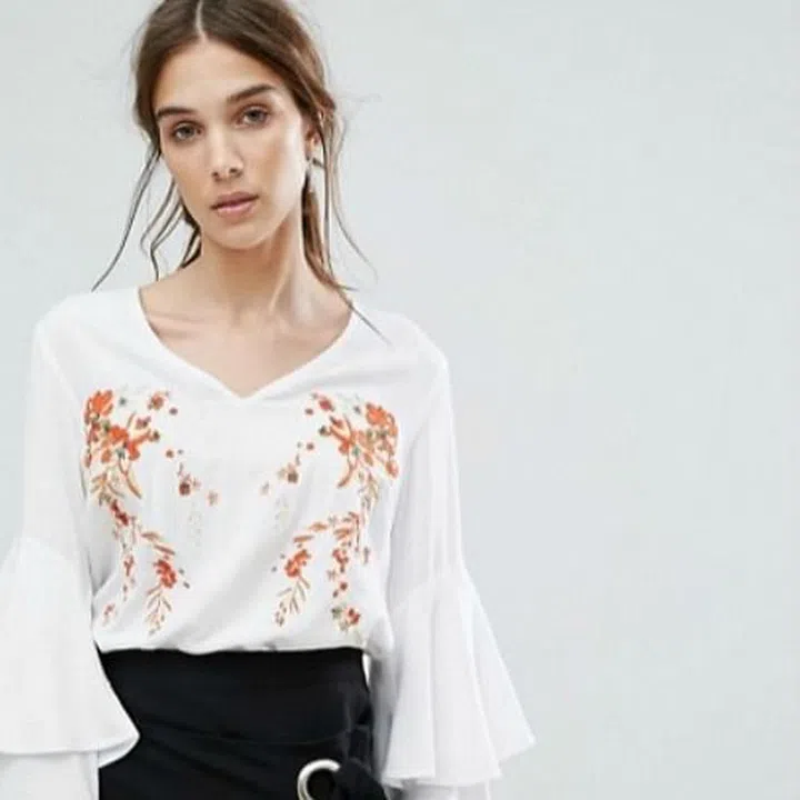 Neon rose v-neck top with layered ruffled sleeves and floral embroidery $64.65 from ASOS