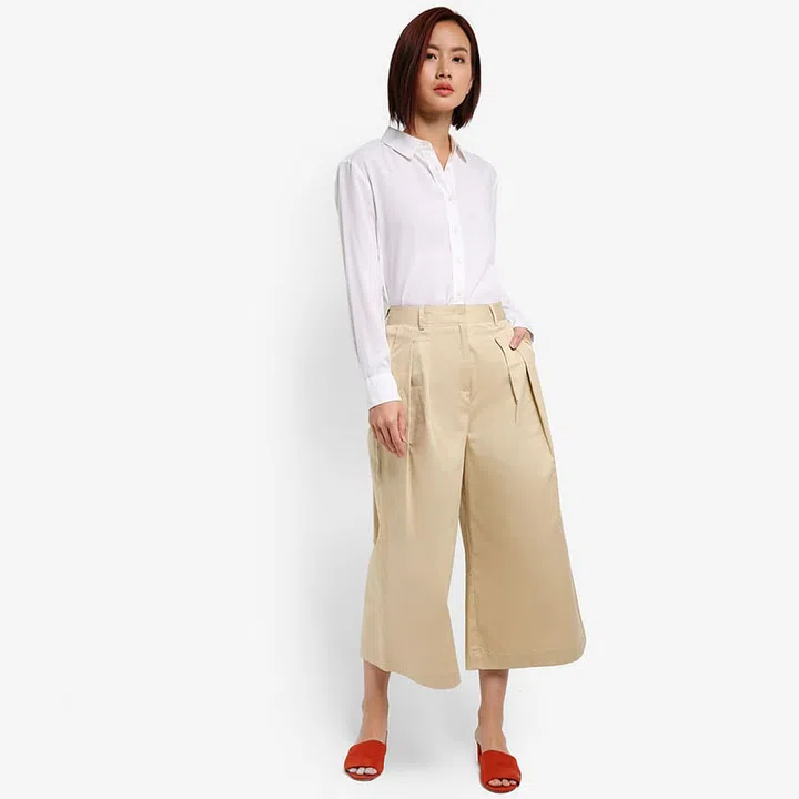 For the minimalist dressers, these mid-rise culottes come in a casual beige shade so you can achieve that laidback look that we’ve seen K-stars like Irene Kim sport. Just tuck in a white tee, throw on lightweight trench coat like this one from G200 and a wear pair of white sneakers.