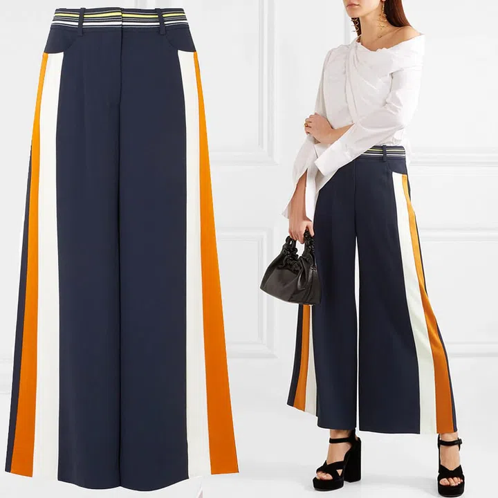 Made from cady, this pair of culottes have a wide, breezy shape that allows for easy movement and air circulation. It comes with a gorgeous white and burnt-orange satin stripes at the side to elongate your figure and is a wonderful contrast of colours.