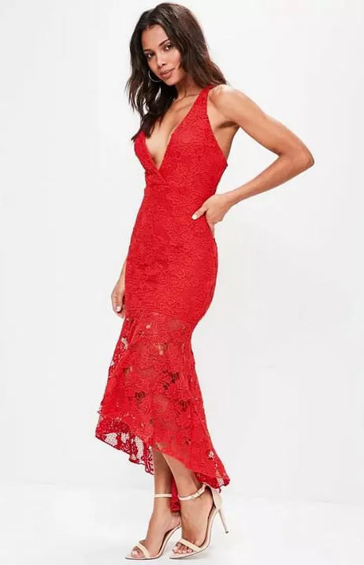 Red and lace has never looked this good or sexy. Bring your curves out in this flattering number with a deep plunge neck, fishtail finish and dropback hem.