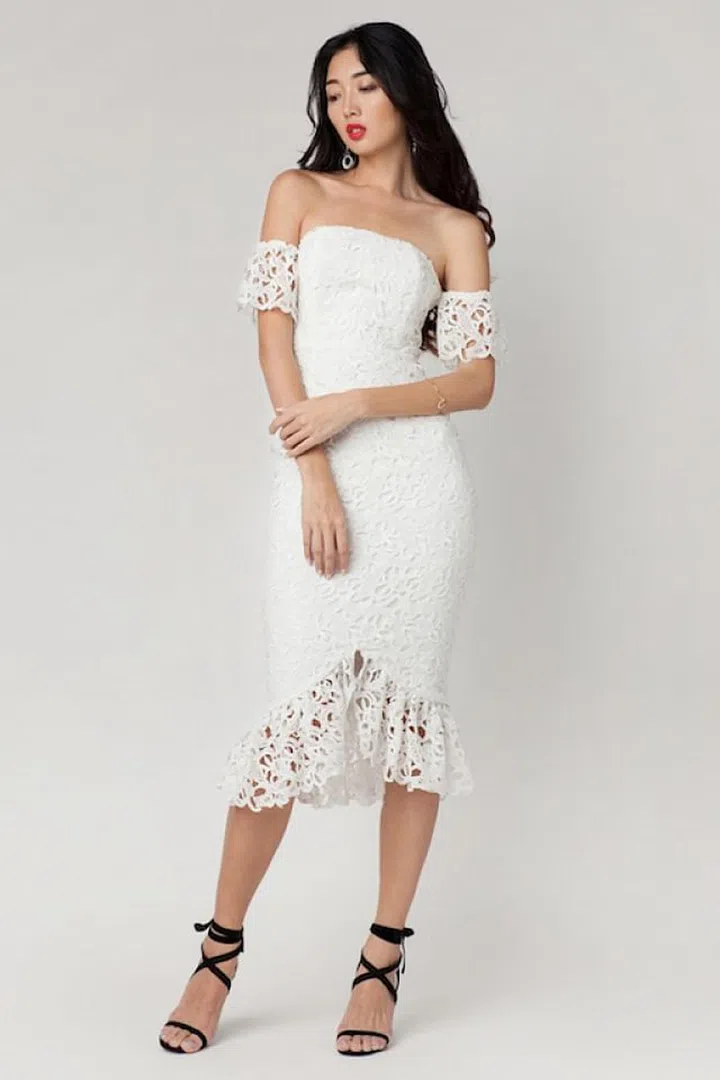 Look ravishing in this alluring off shoulder white lace dress in mermaid cut and ruching details on the sleeve.