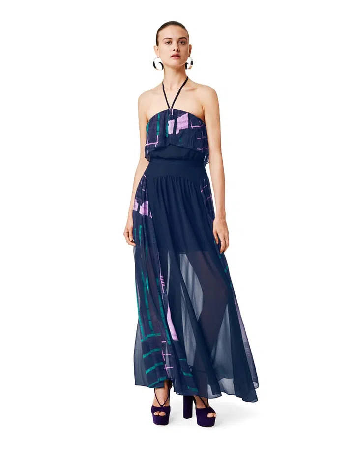 Swish around in this gorgeous halter floor length dress with subtle graphic design and cascading pleats.