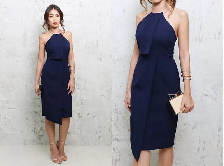 If you're looking for something you can wear for different occasions, then this is the dress for you. Dressy but not over-the-top, this knee-length number stands out with its gold choker and origami pleats.