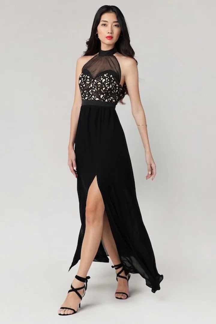 Make flowy strides in this subtly sexy slit halter dress with crochet and chiffon detailings.
