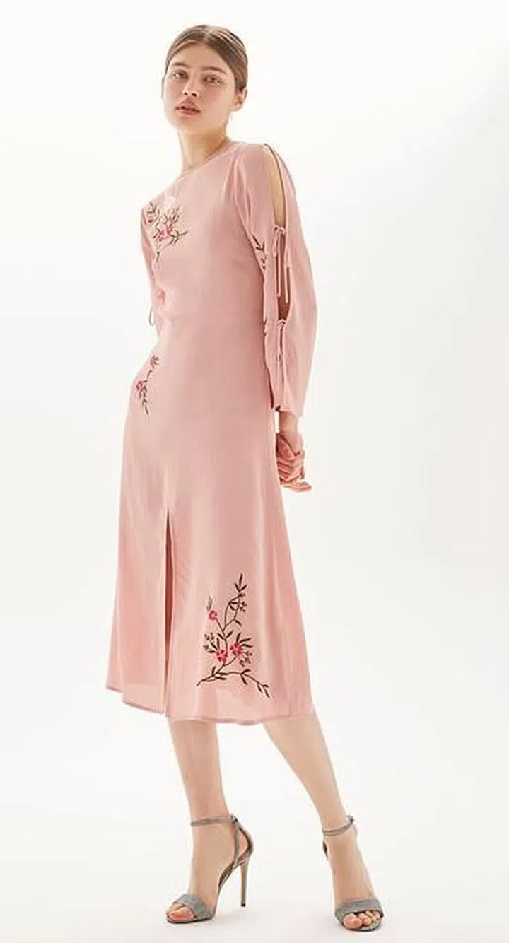 Girlish with a touch of vintage, this pale pink embroidered dress has our heart with its intricate tie and floral details.