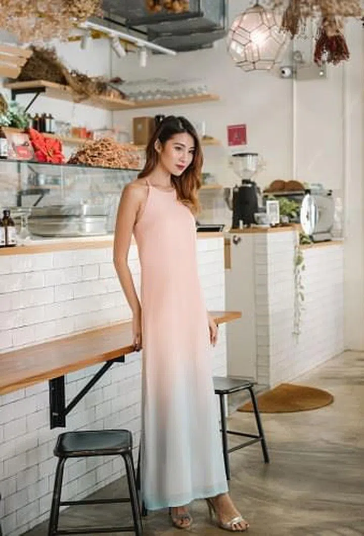 With a sleek maxi trapeze bodice, flowing chiffon skirt and high slit, you'll bound to feel light and fabulous in this pretty ombre dress.