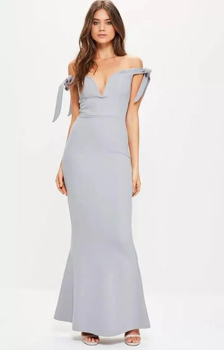 If you're looking for a dress that's not too fierce but still chic and stylish, this ice-grey maxi dress with a subtle fishtail hem is just the thing.