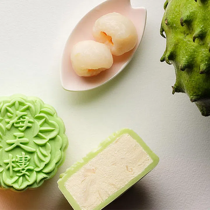 Palate-cleansing and refreshing — that’s what this Lychee & Soursop Mooncake from Pan Pacific’s Hai Tien Lou is. You’re first struck by the pretty, jade-green hue, and when you take a bite, you find the light fruitiness to be utterly delicious.