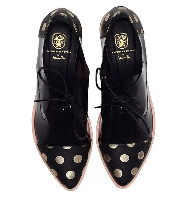 Gold polka dots on leather oxfords are such a cute idea that I wonder why there aren’t more of these. Leave your well-worn ballerina flats at home and swap them for this pair from Hong Kong fashion brand Daydream Nation. The shoe is made from a mixed of cow leather and patent faux leather; the latter also gives it such a dapper, polished sheen.