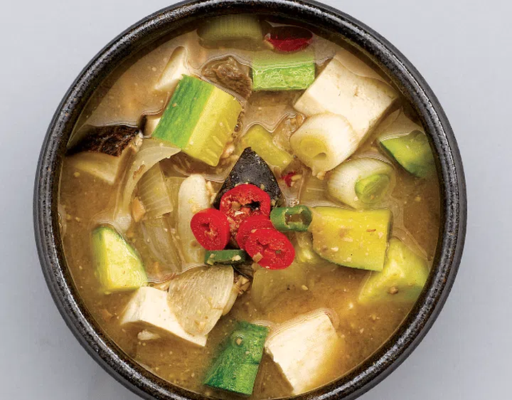Doenjang-seasoned stew made with meat or anchovy broth, or clams, alongside tofu, and summer squash. The broth is thick and flavorful, and good for mixing with rice.