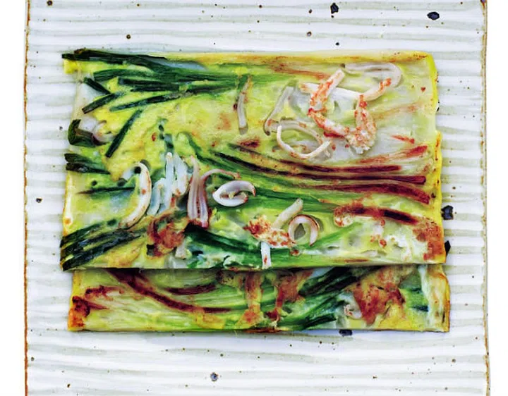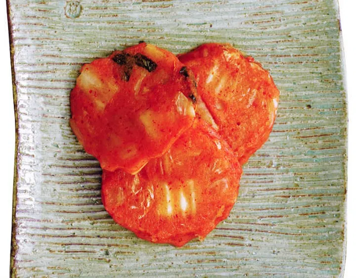Slices of well-fermented kimchi mixed into a flour batter and pan fried. Finely chopped pork, squid, and clam meat may be added to the batter as well.