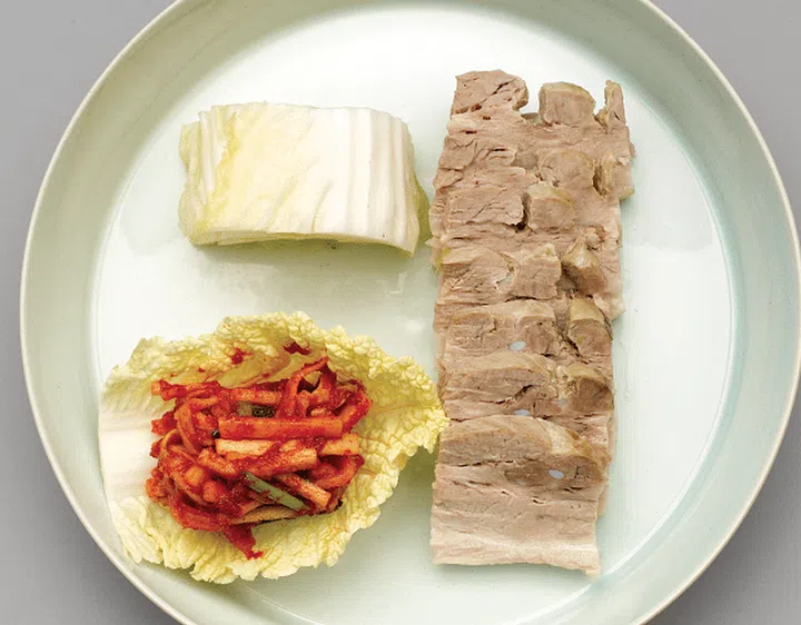 Boiled pork wrapped in cabbage leaves with a spicy relish made of sliced radish. The meat may also be dipped in salted shrimp sauce and wrapped in cabbage or bossam kimchi leaves.