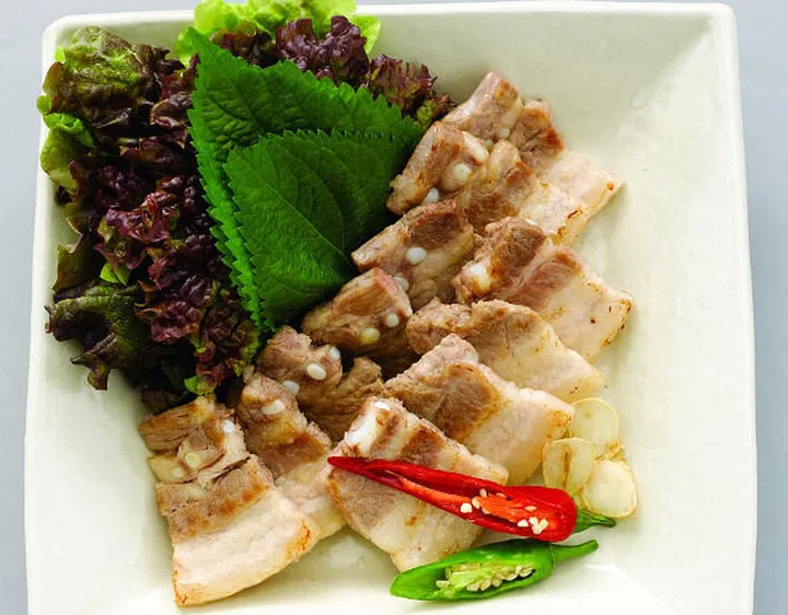 Rich tasting, tender fat-streaked pork belly grilled and dipped in salt or ssamjang (red soy paste dip). Also eaten wrapped in lettuce leaves.